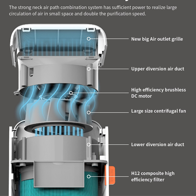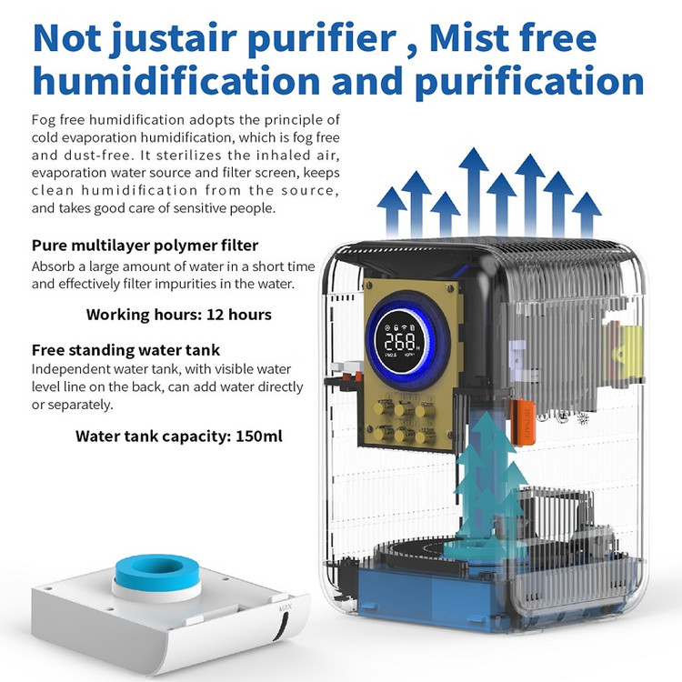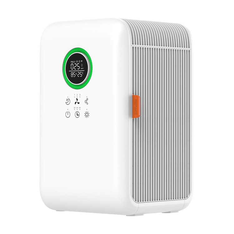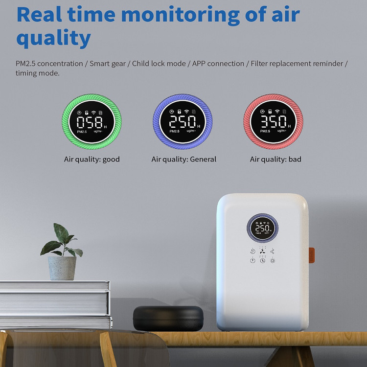 این دستگاه مجهز به سنسور اندازه گیری آلاینده های 2.5PM و نمایشگر کیفیت هوا است .با آب هم برای 12 ساعت کار می کند. 99% آلاینده های بالاتر از 0.3 میکرون را حذف می کند. تایمر دارد.دارای حالت کم صدا برای اتاق خواب است .